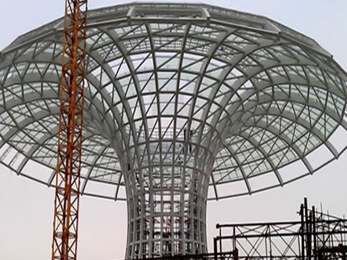 二、球形网架结构因其结构新颖,受力合理,自重轻、用钢量低等优点。如大型体育场馆球形乌鲁木齐螺栓球网架、公共场馆球形网架、电厂乌鲁木齐螺栓球网架、水泥工业球形网架、仓储物流球形网架、乌鲁木齐干煤棚工业球形网架、乌鲁木齐收费站乌鲁木齐加油站球形网架、展览中心、影剧院、商场、航站楼、候车厅、工厂乌鲁木齐车间、仓库、电视塔等球形螺栓球节点网架。国内球形网架结构主要分为:乌鲁木齐焊接球节点网架及螺栓球节点网架两种。螺栓球节点网架其构件工厂内加工量较大,现场安装便捷,适用于现场工期紧,乌鲁木齐施工条件、用电量受制约,网架形状复杂、乌鲁木齐杆件定位困难的异形结构。螺栓球节点球形网架系统基本由乌鲁木齐杆件、螺栓球、支撑支座等组成。按照节点形式可分为交叉乌鲁木齐桁架体系、四角锥体系、三角锥体系等。支撑方式多为固定支座支撑。对于大面积、大跨度及有特殊受力或伸缩要求的网架结构可采用橡胶支座、滑移支座、球铰支座等支撑形式,以满足结构自身的受力稳定、均衡,便于内力释放等设计要求。